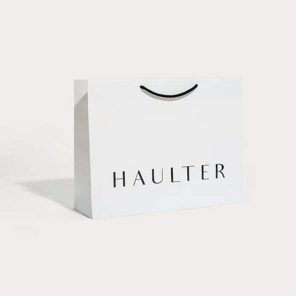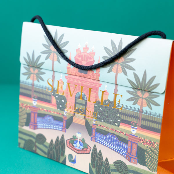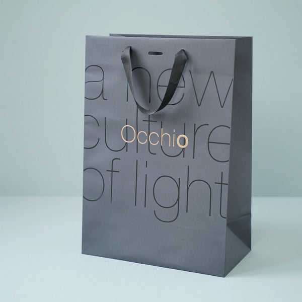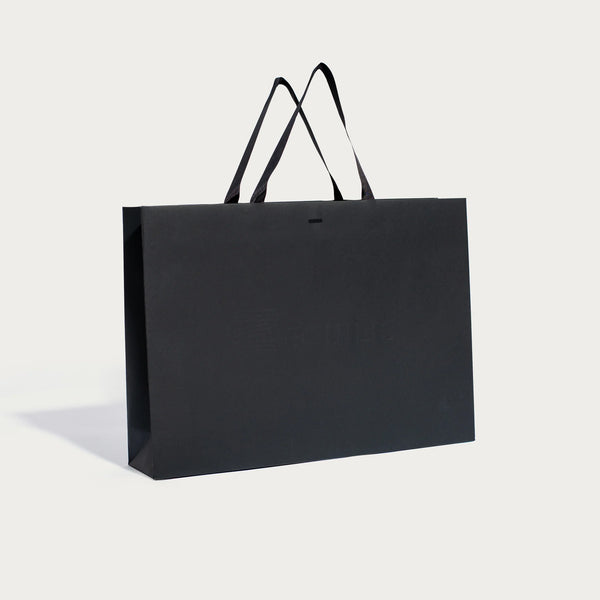 Impresión por golpe en seco y con cintas de Grosgrain pegadas. Al ser una bolsa de papel de lujo, es decir, sin plastificar, la huella ambiental se reduce dramáticamente y el lujo encuentra su encaje con los tiempos que corren.
